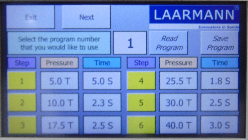 Up to 10 different programs are adjustable setting the pressure in relation to the time. A program consist of 1 to 6 steps. Within each step the press power and time can be adjusted.