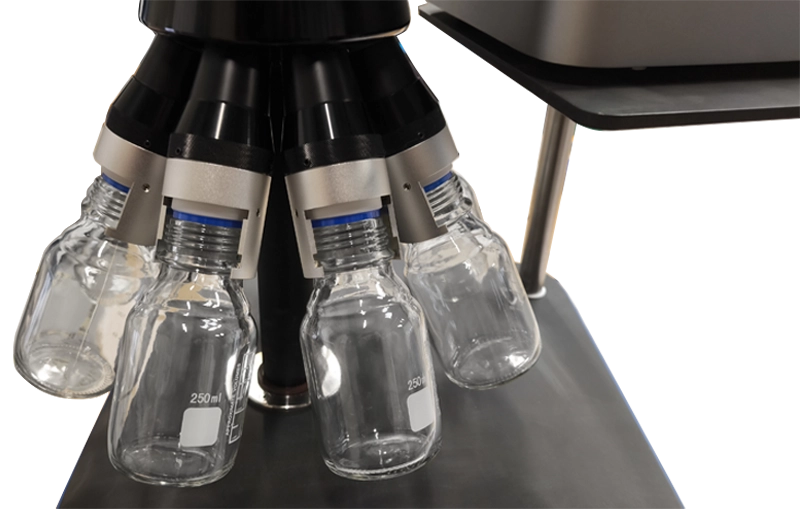 As the bottle carousel passes these outlets, the sample is distributed in equal portions into 6, 8, or 10 collection bottles.
