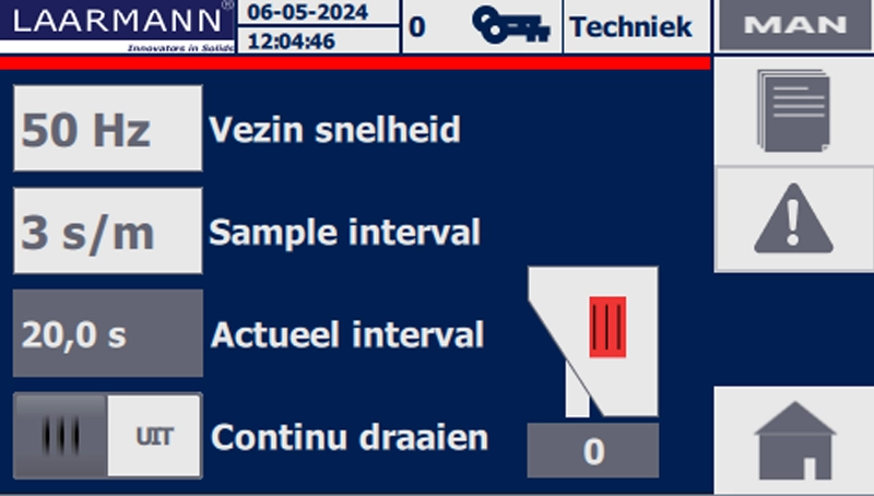 The machine needs to be placed within an existing or new to build installation for in-line sampling. With the use of an axle, driven by an electrical motor, the spoon is moved through the product stream collecting the required sampling amount. The frequency of the spoon can be controlled by the control box.