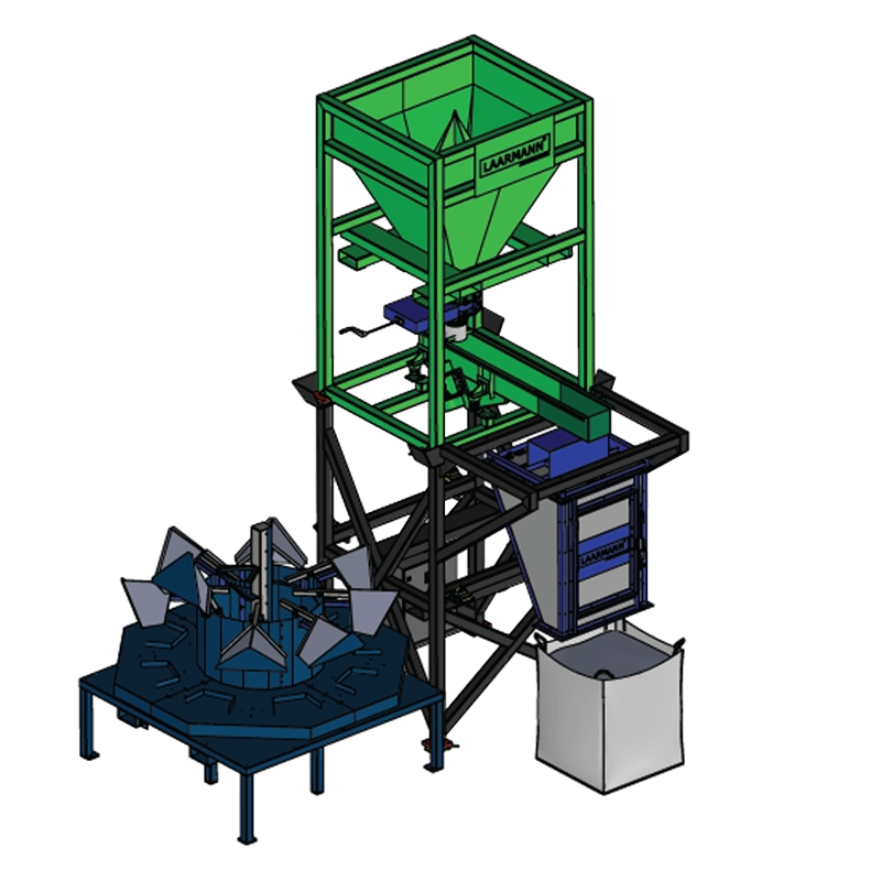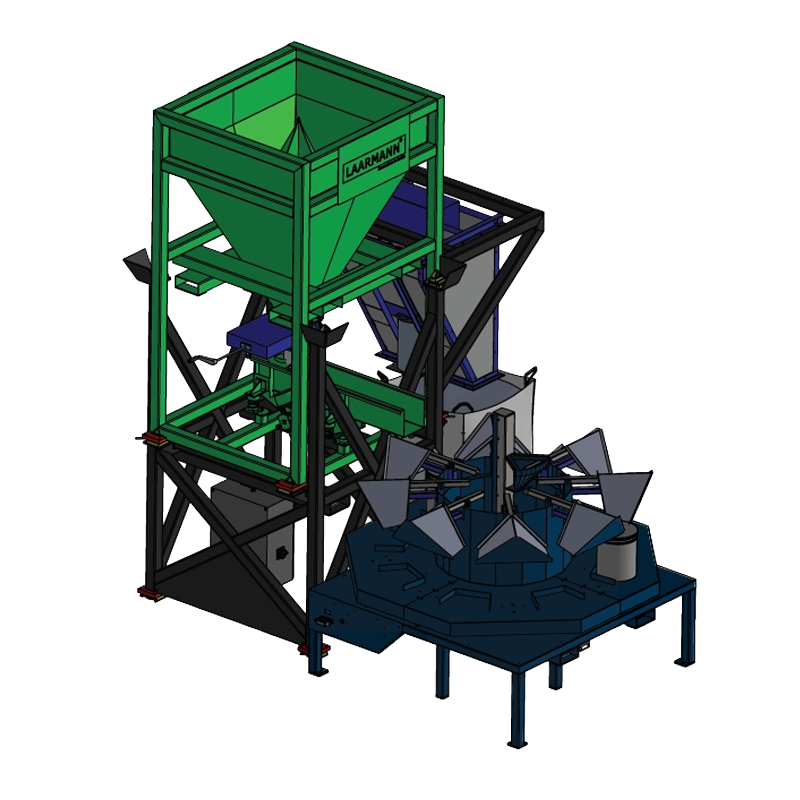 Material is loaded into the large funnel using a forklift. This material typically arrives directly from delivery and is packed in big bags. Once loaded, a vibratory feeder transports the material either:- Onto a rotating carousel with dividing heads, or