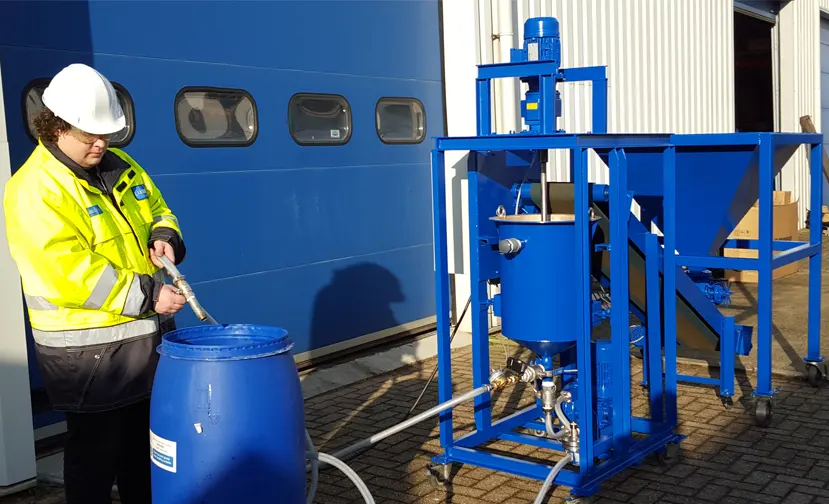 The speed of the feeding belt is determined by the amount of water in the mixer. The material will be mixed with water and can then be used and dispensed with a pressure hose.