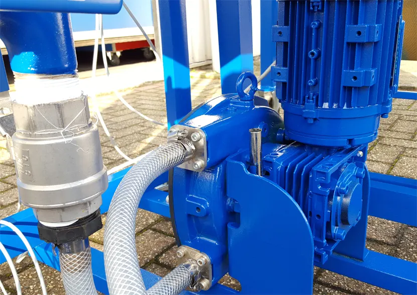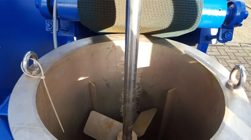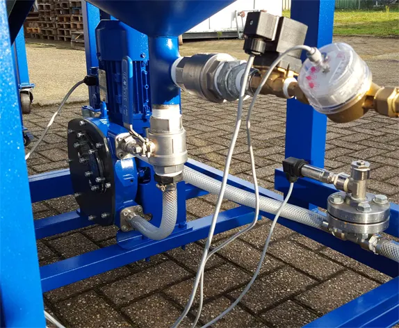 In the main unit consist of the control unit, the mixer, the water dosing, and the extraction pump with a pressure sensor. The conveyor belt connects to the main unit with a plug so it can be separated for cleaning. The solids dosing hopper connects to the main unit with a plug so this can be separately cleaned and filled easily